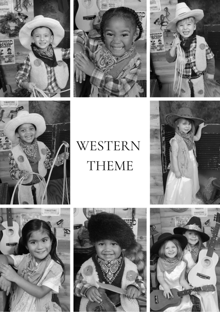 Our photographer brings all wardrobe and props (vintage or western). Sessions are quick and fun—about 8 minutes per child, with up to 80 children photographed in one day.