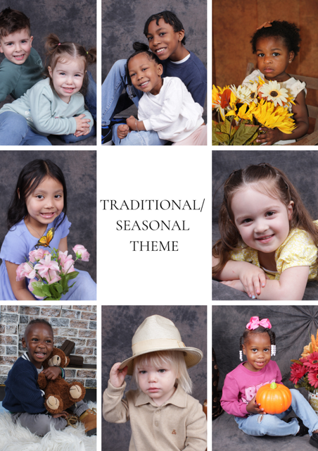 Celebrate timeless elegance with our Traditional Photography Sessions. Students wear their own clothes, and will be captured against simply styled backdrops that highlight the innocence and joy of childhood. With soft lighting and minimal props, we create portraits that feel warm, nostalgic, and truly timeless.